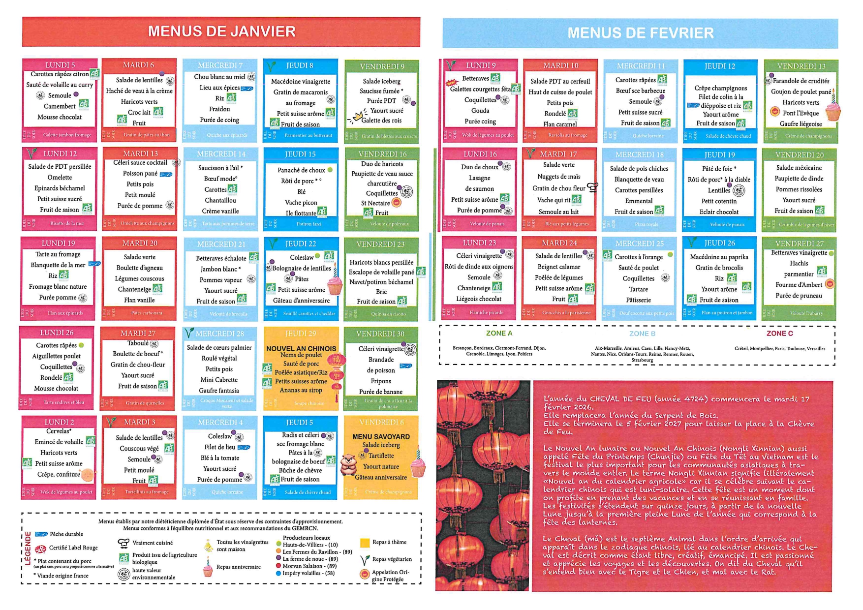 Voici ce que les élèves de l'école de la Colombe dégusteront en Janvier et Février 2026. Bon appétit !