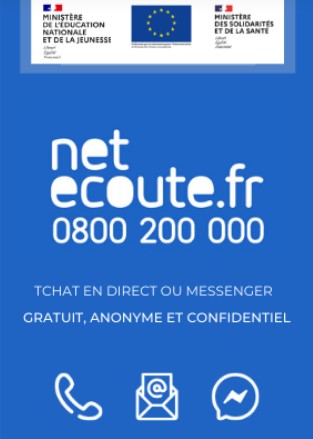 Gratuit, anonyme et confidentiel Net Ecoute est le numéro vert national spécialisé dans les problématiques que rencontrent les enfants et les ados dans leurs pratiques numériques, et notamment le cyber-harcèlement. Notre équipe d’écoutants est disponible du lundi au vendredi, de 9h00 à 20H00 et le samedi de 9h00 à 18h00, pour aider les jeunes mais aussi conseiller les parents et les professionnels concernés.0800 200 000