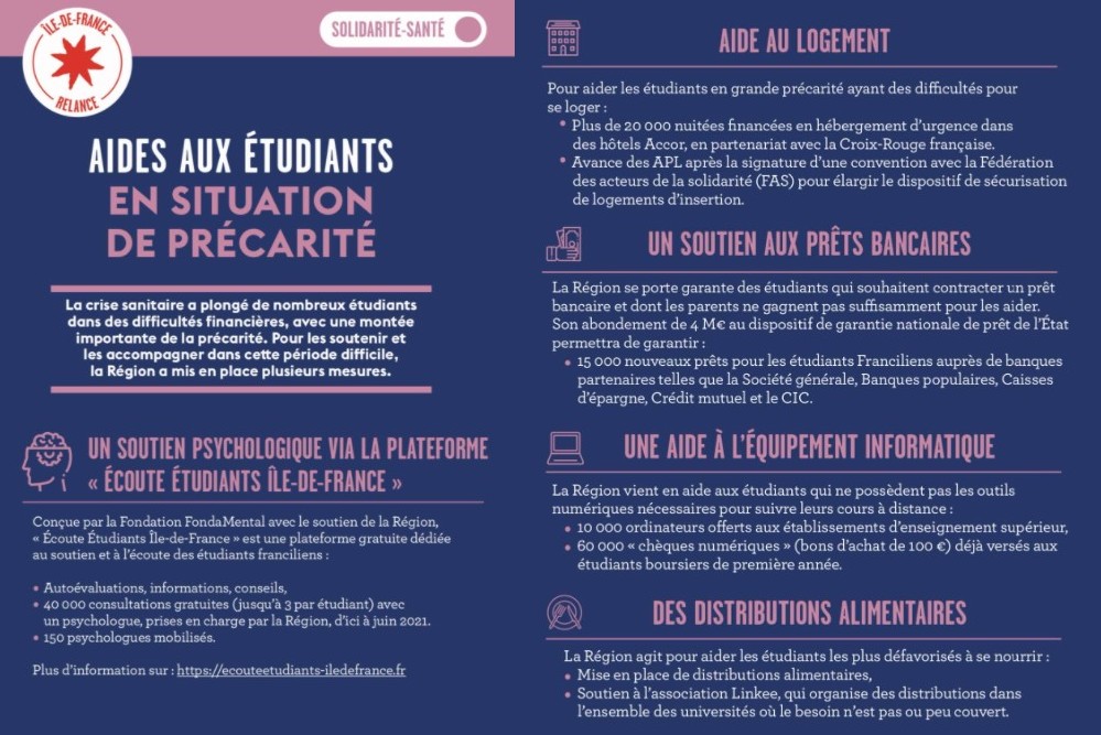 - Une détresse psychologique => Face à cette situation, la Région Île-de-France met en place, dans le cadre de son programme « Région solidaire », un plan de secours composé de plusieurs mesures fortes à destination des étudiants franciliens.